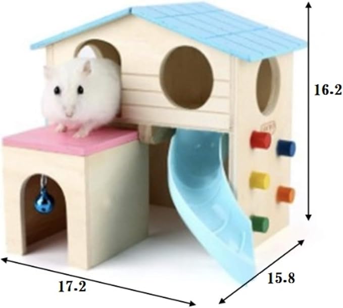 ハムスターははしごやボルダリングを使い自由に上下移動でき、日々の楽しみを与えます。 丈夫で実用的すべての仕上げは無毒で匂いのないハムスターが喜ぶお家です ベルを装備し、音を鳴らすことでハムスターに楽しみを与えます。 ゆったりとしたデザインで小動物にとって十分なスペースで自由に上下移動でき、日々の楽しみを与えます。 サイズ:約17.2㎝ 15.8㎝ 15.5㎝