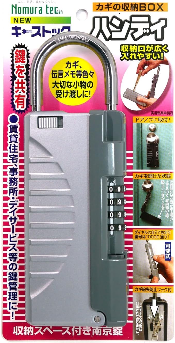 鍵を共有! 収納スペース付き南京錠! カギ、伝言メモ等色々大切な小物の受け渡しに! 賃貸住宅、事務所・デイサービス等の鍵管理に! 収納口が広く入れやすい! ダイヤルは可変式で自分で設定可! 番号は10000通り! カギ紛失防止のためのフックを収納部内側に設置 施錠・解錠はダイヤル式でキーは不要! 倉庫等で使用されるロングキーや自動車の大型キーも収納可能! ご注意(免責)>必ずお読みください ●ヒモ・ナスカン等は付属せされておりません。