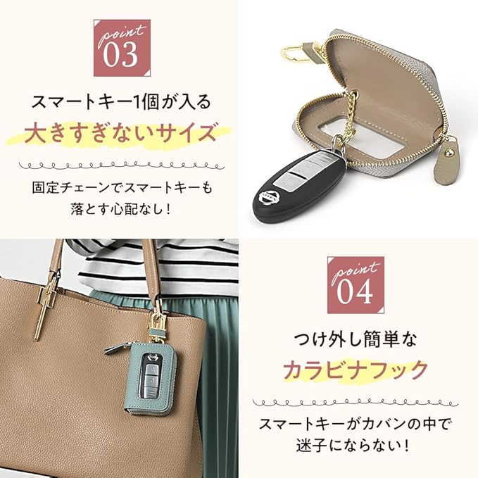 【小さくて軽い。ポケットやバッグにもすっきり収納】 スマートキー1個専用のコンパクト設計で、ポケットや小さめバッグにもスッと収まります。厚みを抑えたスリムな形状ながら、しっかりしたつくりで安心感も◎。軽量なので持ち歩きも快適。普段使いはもちろん、旅行や出張時にも荷物を増やさずに携帯できます。ミニマルで無駄のないフォルムが、スマートな印象を演出します。