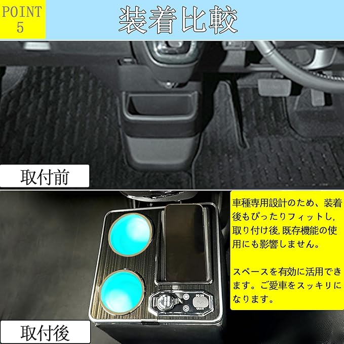 【機能性がアップ】:エヌボックス コンソールボックスは電源ソケット、Type-CとType-A、シガーソケット、LEDスイッチなどのコントローラーが配置されています。ドリンクホルダーはもちろん、引き出しに財布、鍵、コイン、カード、データケーブルなどををスッキリ整理でき、車内をキレイに!新型nbox JF5/JF6の限られた車内空間を十分に利用できます!隙間にもピッタリ収まり、小物が散ばることが無くなります!