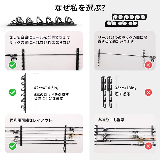 収納能力: 6本の釣竿を垂直に収納できる壁掛け式ラック、スペースを効率的に活用可能