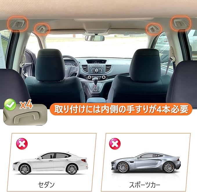 【対応車種】車内のアシストグリップが4箇所あれば対応できます!左右の距離が110cm~155cmまでならOKです!
