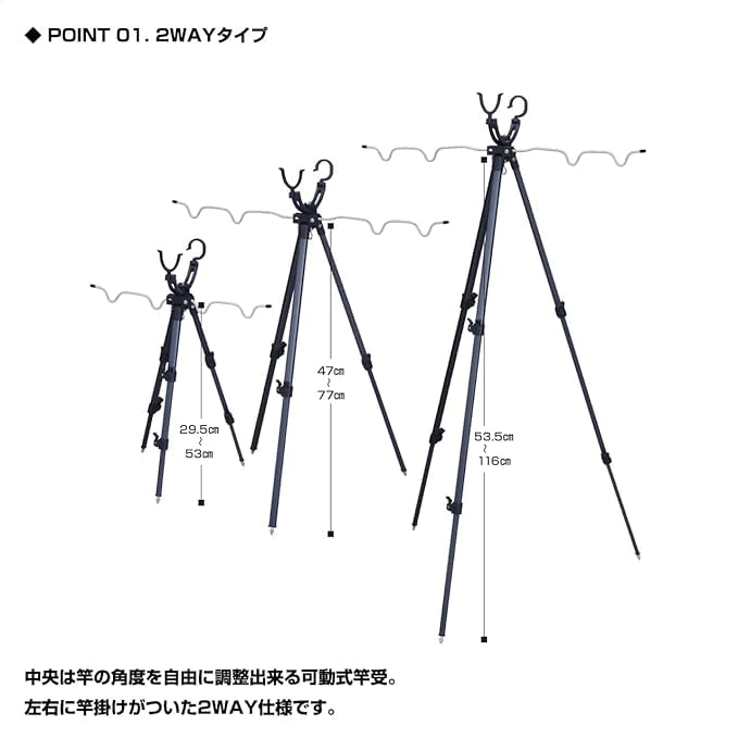 脚は伸縮、竿掛けは折りたたみが可能でコンパクトに持ち運び可能です。