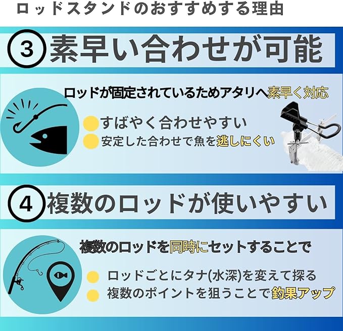 【手が自由になる】竿置きとしての役割を果たすロッドスタンドを使用することで待ち時間を自由に使用することが出来ます。またロッドが固定されることで餌が自然に泳ぐため魚に不要な警戒心をあたえることが少なくなります。