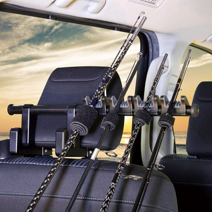 ●釣竿を置くだけ。ヘッドレスト用ロッドホルダー。●ヘッドレストポールに簡単装着。●凹凸ラバーで細い穂先もしっかり設置でき、すべりも軽減。●ロッドをホールドするホルダーが4個付いており、使い勝手に合わせて自由に配置することができる。●車両の形状やロッドサイズ、使用用途に合わせて置き方を変えることができる。●バッグや小物等を掛けるフック付き。