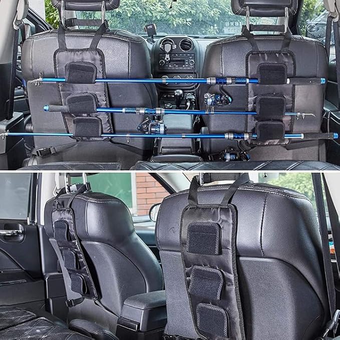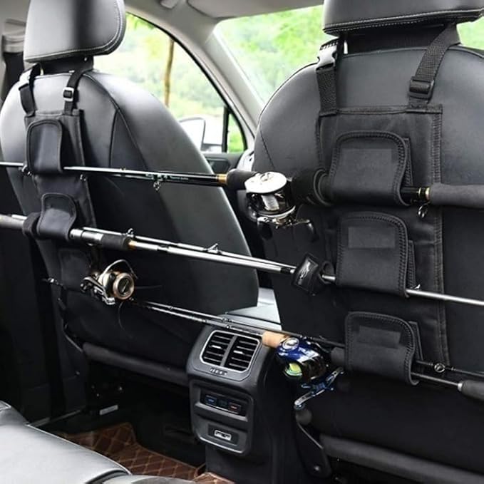 【車用2個セット・釣り竿ホルダー】前席ヘッドレストに取り付けるだけで、釣り竿を水平に固定できる車載ロッドホルダー。2個セット仕様で、走行中の揺れや転倒を防ぎ、安全に釣り竿を収納できます。