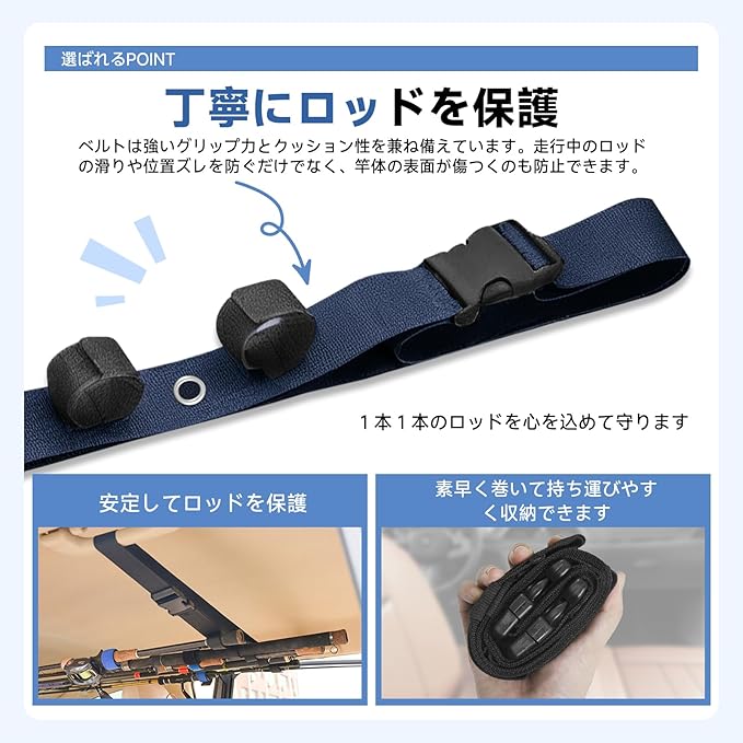 【最大 5 本収納対応】ハイカー、ルアーロッドなど、竿元径 45mm 以下のロッドであれば最大 5 本を固定可能です。ベルトはグリップ力があり柔らかい素材で、走行中にロッドがズレたり衝突したりすることがなく、表面が傷つくのを防げます。高価なロッドも安心して持ち運べます。