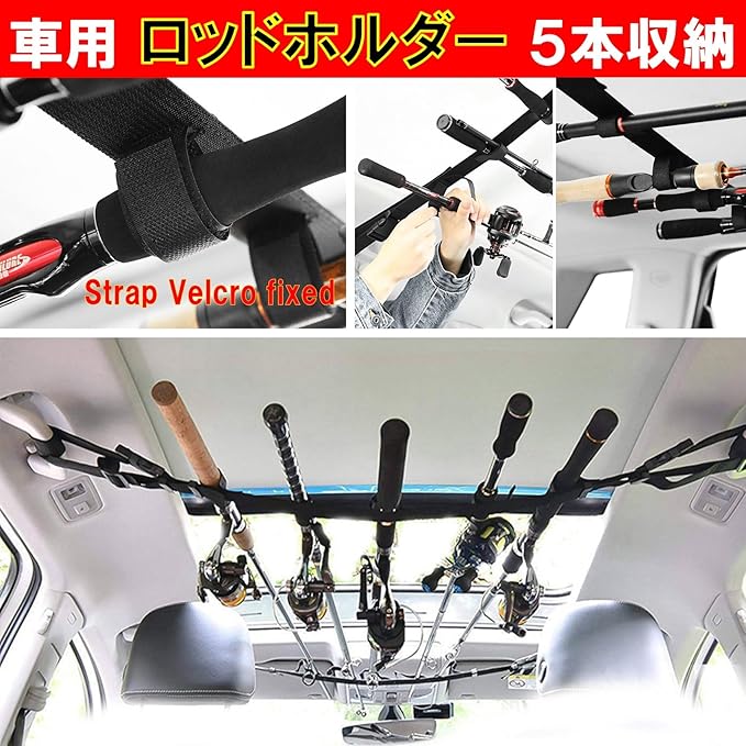 車の天井部分に釣り竿を5本収納できる車載用ロッドホルダーベルトタイプです。高粘着ベルクロで釣り竿をしっかり固定できます。取付けベルトは110~155cm調整可能で様々な車種に適応します。フィッシング、BBQ、キャンプなど多様なシーンでご活用いただける車載用ロッドホルダーです。限られた車内スペースの有効活用にお役立てください。