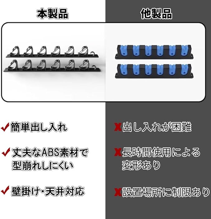 【省スペース&しっかり収納】 最大6本の釣り竿を収納できる、壁掛け・天井取リ付け対応のロッドホルダー。 限られたスペースを無駄なく活かし、釣り道具をスッキリ収納できます。 ガレージ、物置、釣具部屋に最適!