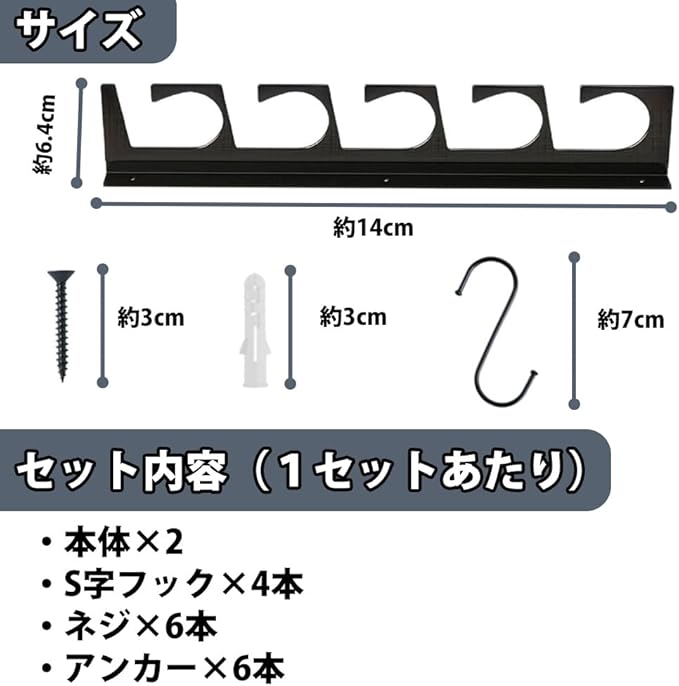 【セット内容】 1セット:本体 2 S字フック 4本 ネジ 6本 アンカー 6本 2セット:本体 4 S字フック 8本 ネジ 12本 アンカー 12本