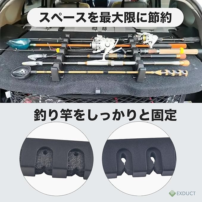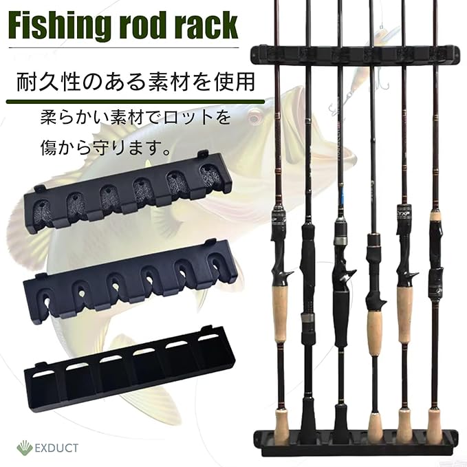 釣り竿をしっかり固定できるので散らばりにくくスペースを最大限に節約できます。固定部分は繰り返し固定できる素材なので簡単に取り付け、取り外しができます。