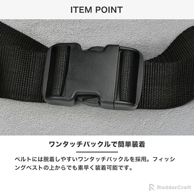【ワンタッチバックルで簡単装着】ベルトには脱着しやすいワンタッチバックルを採用。フィッシングベストの上からでも素早く装着可能です。