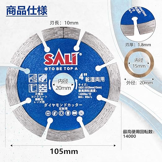 外径(Φmm):105mm、刃厚(mm):約1.8mmの薄型設計、刃長(mm):10、本体穴径(Φmm):20、付属リング穴径(Φmm):15