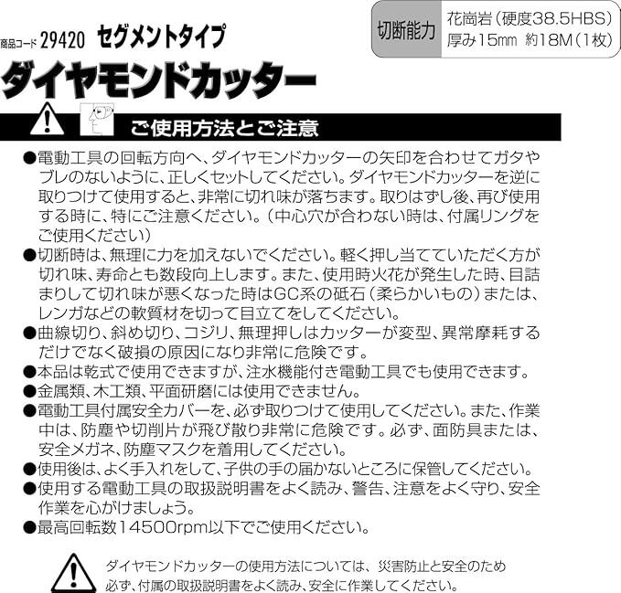 切断能力:花崗岩(硬度38.5HBS)厚み15mm/約18m