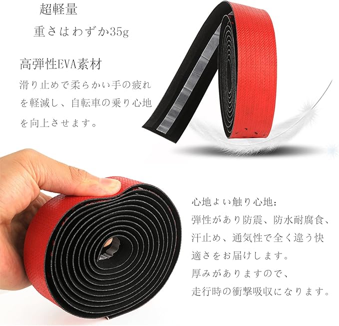 固定用テープ付きなので取り付けも簡単でズレ難い。耐久性が高いのでちぎれたり、緩んできたり、伸びたりしにくいバーテープです。良い握り心地感触はスベスベモチ。