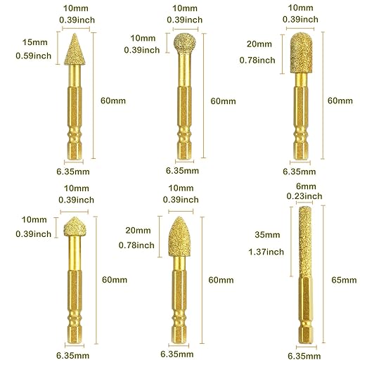 多様な形状の6本セット:様々な用途に対応できるよう、6種類のヘッド形状の超硬バーをセットにしました円筒先丸型、ボール研削ヘッド、円筒平頭型、砲弾型、テーパー型、弾頭先丸型、用途に合わせて形状を選定可能です