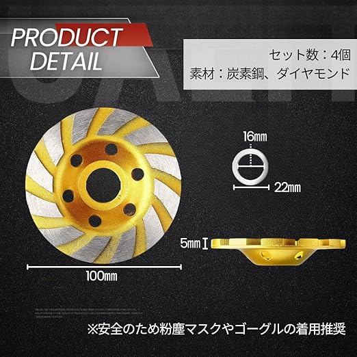 【商品内容】セット数:4個 サイズ:(直径)100mm (穴径)22mm/16mm (刃厚)約5mm 素材:炭素鋼、ダイヤモンド カラー:ゴールド