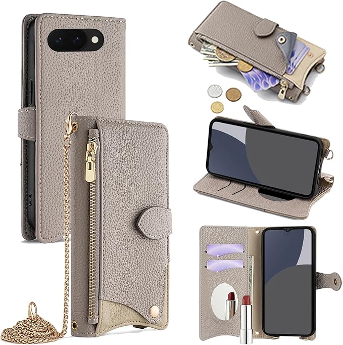 For Google Pixel 9A ケース 手帳型 ショルダー For グーグル ピクセル 9A カバー 財布型 肩掛け 横+縦 2掛け方 斜めがけ 化粧鏡付き おしゃれ ジッパー小銭入れ カード収納 横置き ロングストラップ 耐汚れ PUレザー 防指紋 高耐久性 女性用 贈り物 COCOCLOUD グレー