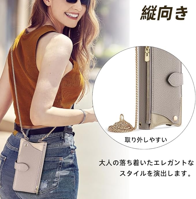 快適な持ち心地と使いやすさ: 付属クロスボディチェーン、全長120 cm。金具の装飾が美しさと上品さを漂わせてます。斜めがけ、肩掛け、通勤、旅行、犬の散歩、山登り、海へ行く、買い物、外食、重い荷物を持っている時、子供を連れて外出する時もスマホを紛失すること心配なく両手が解放されます。また、マグネット式の留め具により、片手で簡単に開閉ができ、スタンド機能も兼ね備えています。