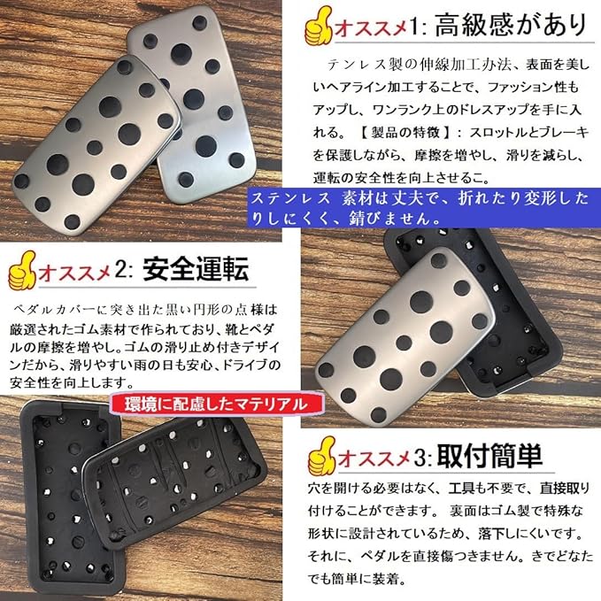 【高級感があり】テンレス製の伸線加工办法、表面を美しいヘアライン加工することで、ファッション性もアップし、ワンランク上のドレスアップを手に入れる。表面硬度が高いため耐久性も高く光の加減でキラキラ光るため見た目の高級感もアップします、高級車のような印象を与えます。【 製品の特徴 】:スロットルとブレーキを保護しながら、摩擦を増やし、滑りを減らし、運転の安全性を向上させるこ。