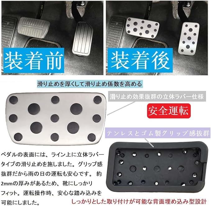 【取付簡単】穴を開ける必要はなく、工具も不要で、直接取り付けることができます。 裏面はゴム製で特殊な形状に設計されているため、落下しにくいです。それに、ペダルを直接傷つきません。純正のペダルカバーを取外し、取り付けるだけの簡単装着で女性の方でも簡単に装着が可能です。【取付方法】:1.アクセルペダルは純正ペダルの上から本製品を被せてください2.ブレーキペダルは純正のゴムカバーを外してからお取付ください。※気温が低い時期はゴムが硬化します。ドライヤーなどで温めてから作業をすると取り付けやすくなります。
