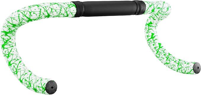 Supacaz Bartape - スーパースティッキークッシュ - スプラット - リミテッド- ホワイト/ネオングリーン + ブラックスタープラグ - サイクリングハンドルバーテープ
