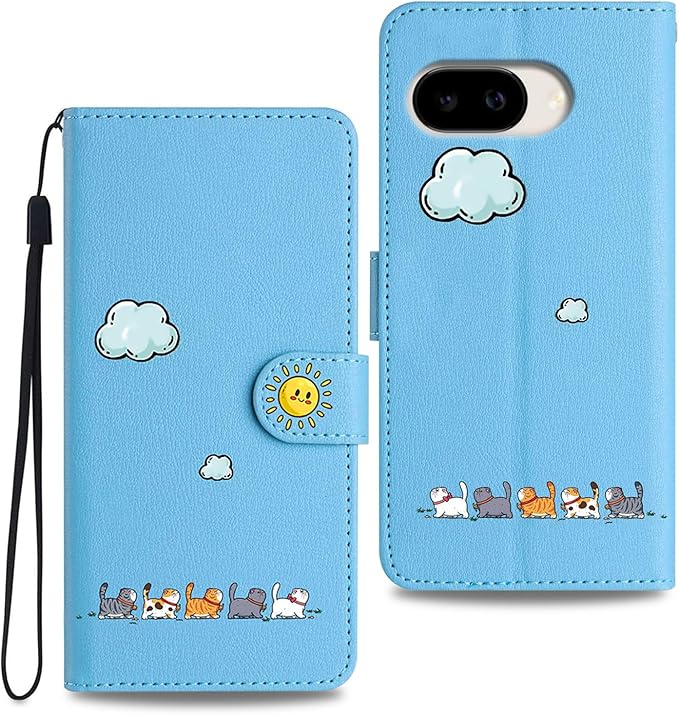 対応 Google pixel 9A ケース 手帳型 耐衝撃仕様 - グーグルピクセル9aケース手帳型 スタンド機能&カード収納付き 薄型軽量 いぐーくるぴくせる9aケース 可愛い猫デザイン - 青