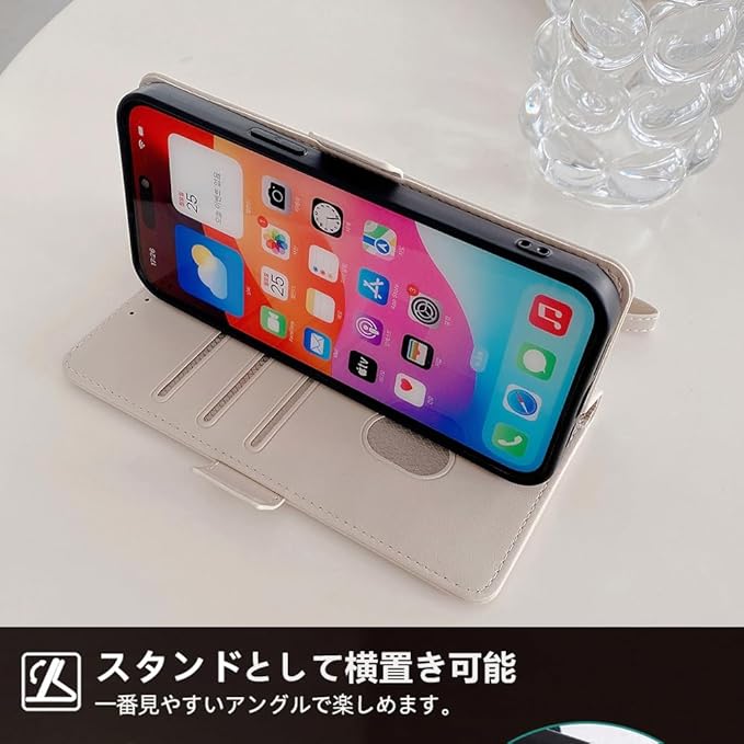 【機能性3:スタンド機能付き】2つ折りの折り目を設置しておきます。横に置いてスタンドとしてご利用ができます。横向いて斜めに立てて両手を解放し、お気軽に読書やビデオのお視聴を楽しめます。スマホケースには機能性と実用性は大切です。