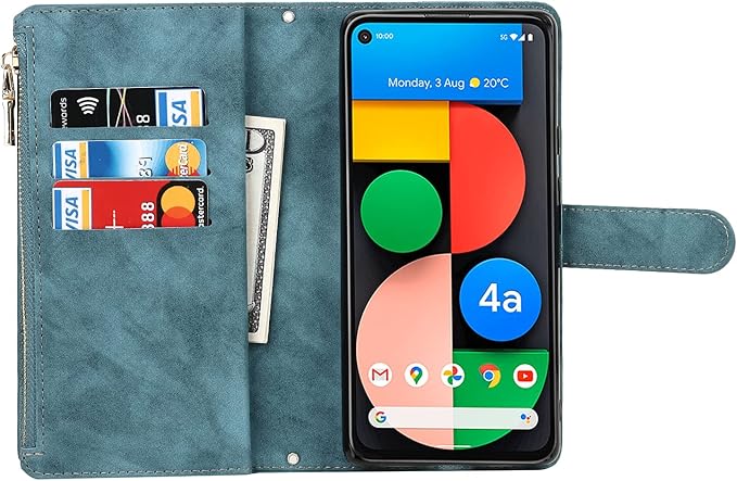 for Google Pixel 4A 5G ケース for google pixel4a 5g 縄掛けケース 手帳型 財布型 ICカード コインポケット ストラップ付き カード 収納 小銭入れ ファスナーポケット付き PUレザー 6色ブルー