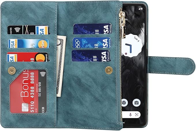Eastwave for Google Pixel 7A ケース for pixel 7a google 縄掛けケース Pixle7A 手帳型 財布型 ICカード コインポケット ストラップ付き カード 収納 小銭入れ ファスナーポケット付き PUレザー 6色ブルー