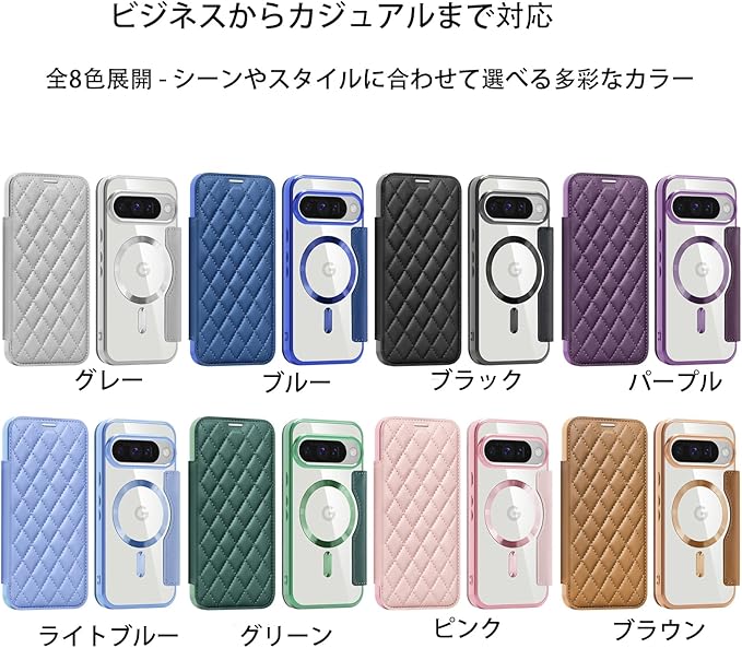 【対応機種】Google Pixel 10/10 Pro専用デザインのフリップ型カバーです。 上質な手触りと高い耐久性を兼ね備えた素材を採用。前面は高級感のあるPUレザ背面はクリアTPUで端末全体を保護。MagSafe完全対応の強力磁気リング内蔵で、ワイヤレス充電やMagSafeアクセサリーがスムーズに利用可能。