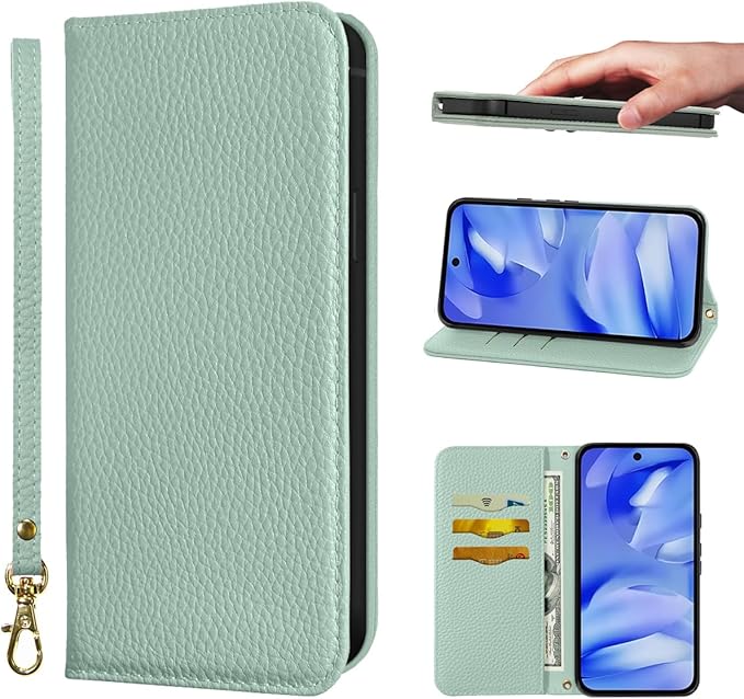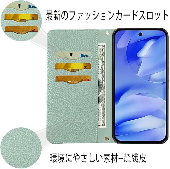 Google Pixel 9A 5G ケース 手帳型 超繊皮カバー Google 9A 手帳型 耐衝撃 保護カバー 内蔵マグネット 財布型 Pixel 9A 携帯カバー カードポケット スタンド機能 リストバンド - ライトグリーン