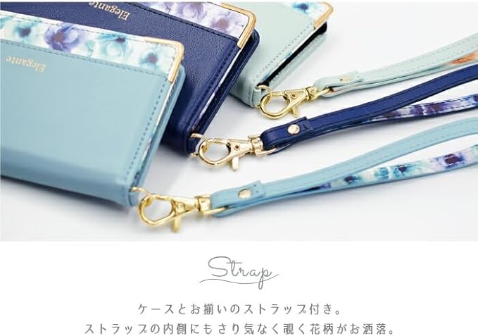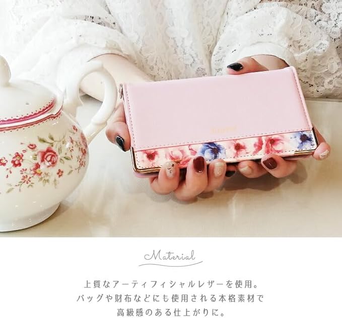 【美しい花柄デザイン】優しいカラーリングが大人かわいい花柄の手帳型 スマホケース。ケースの外側・内側、さらにストラップの内側にも花柄を使用しております。ケースの角には上品に輝くゴールドパーツを施しました。細部にまでこだわったスマホケース 手帳型です。【素材】上質で手触りの良い"アーティフィシャルレザー"を採用、内部のケースはブラックのポリカーボネートケースを使用しています。