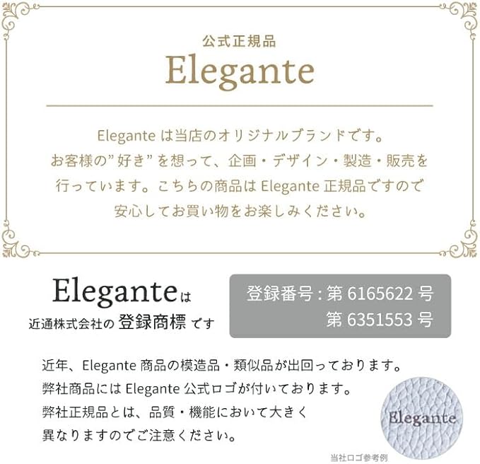 Elegante(エレガンテ):『あなたの好きを、あなたの身近に』をコンセプトに、お客様の“あったらいいな”が、“ここにあった!”に変わることを目指して、すべて日本国内の自社で、商品の企画から開発・デザインまでしています。※最近、模倣品が出回っておりますので、ご注意ください。正規品にはすべてEleganteの刻印がございます。(Elegante エレガンテは、近通株式会社の登録商標です)