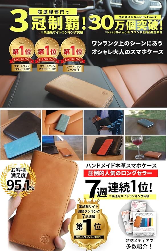【きめ細やかな手触りのいい本格レザー】は、鼻を近づければ革の香り、しっかりとした感じ、持つたびに手に馴染む使う楽しみ♪ 本格的な高品質の牛革で職人が一つひとつ丁寧に作り上げたオリジナルのケース! スマホケース ブランド「NeedNetwork」の始まりは、世の中には”安っぽいスマホケース”しかなく、それを使うのが嫌で「なければ自分で創ろう!」というオーナーの思いからスタートしました。 よくある手帳型ケースとは”モノ”が違います。 すぐボロボロになる合皮・PUレザーは問題外ですが、本革でも使い込むとなりがちな”ペラペラにくたびれる感じ”なりにくいように仕上げています。