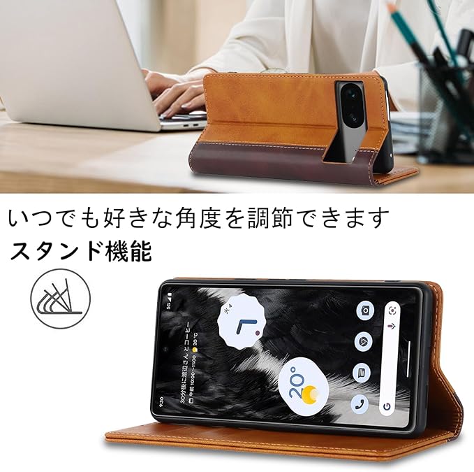 【収納機能】Google Pixel 7aケース内側には三つのカード入れとフリーポケットがつき、カード類や紙幣、名刺などが収納できます。カードスロットに2枚のカードを入れると、内蔵マグネットの機能を最大限に発揮し、カードが消磁されるのを防ぐことができます。横置きスタンド機能が付き、横向いて斜めに立てて、自由に角度を調整して、お好みの角度で動画鑑賞や読書などを楽しめます。長時間での新幹線、飛行機の中での暇つぶしに最適です。