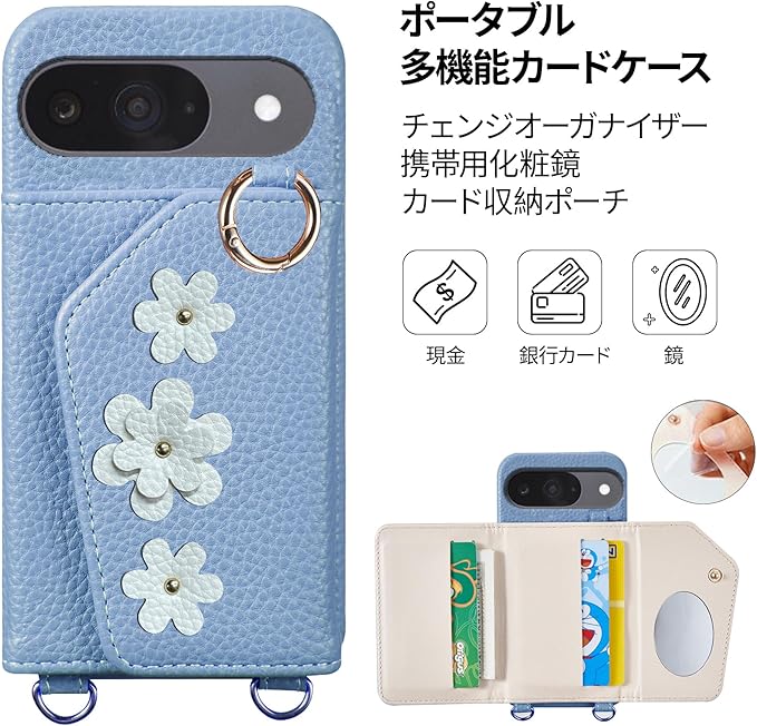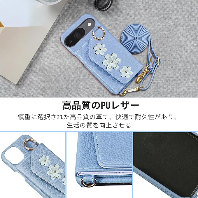 対応機種:Google 9/ 9 Pro - 6.3 インチ首掛け/斜め掛け長さ調節可能な同色のベルトを装備し、片肩、斜め掛け、首掛けで着用できます。散歩、ショッピング、旅行、観戦など、さまざまなシーンで便利に使用できます。ストラップは非常に細く、長時間着用しても痛くなりません!背面収納背面の財布型デザインには、カード、名刺、月間パス、運転免許証、写真などを収納できる4つのカード収納ポケットがあります。財布はボタンで開閉し、しっかりと安全です。化粧鏡も付属しており、女の子の毎日の化粧の補助に最適です(鏡には保護フィルムが付いていますので、使用前に保護フィルムを剥がしてください)スタンド機能背面のカードバッグを開くと、カードバッグの両側を広げると、デスクトップに携帯電話を水平に置くことができ、ビデオ通話や映画鑑賞時に手を自由にすることができますよくできていますシェルは高品質のPUレザーで作られており、防水性、耐摩耗性、手触りが快適です。背面の小さな花のユニークなデザインは、携帯電話ケースをよりファッショナブルで美しくします。5色から選択でき、女性のために特別に選ばれた優しい色で、生活や仕事のあらゆる場面に適しています