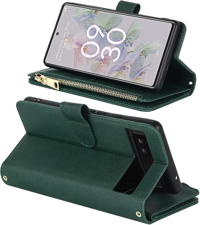 Eastwave for Google Pixel 6A ケース for pixel 6a 縄掛けケース 手帳型 財布型 ICカード コインポケット ストラップ付き カード 収納 小銭入れ ファスナーポケット付き PUレザー 6色グリーン