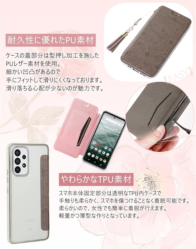 Google Pixel 7a 手帳型ケース 花柄 大人 かわいい FASY グーグル ピクセル7a 携帯カバー Pixel7A ケース メタリック カードポケット カード収納 SoftBank スマホケース 携帯ケース クリア 透明 軽量 薄型 タッセル チャーム ストラップ付き 手帳型 大人 おしゃれ かわいい 耐衝撃 革 女子 TPU マグネットなし グレー