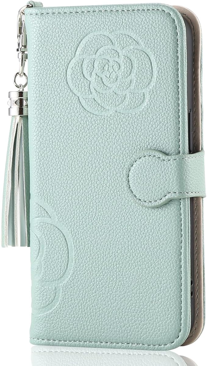 Google Pixel 8A 手帳型スマホケース 鏡付き オリジナルなデザイン 押し型の花柄 カメリア レディース タッセル付き 持ちやすい Google Pixel 8A 手帳型携帯カバー 上品 シュリンク革 爽やか 優しい雰囲気 グーグルピクセル8A カバーケース 財布型 使いやすい 個性的デザイン 上品材質 マグネット式 スタンド付き 男女通用 グリーン