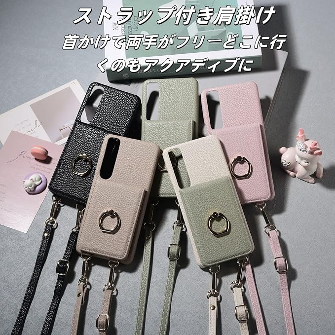 【ショルダータイプ + リング付き +ミラー+カードケース】背面 落下防止 リング、ストラップ、カード入れ、カードが3枚入りますが(横に差し込む3枚入り) 交通ICカードやポイントカードなどを入れることができます。取り外しが簡単にできるところも使い易いと