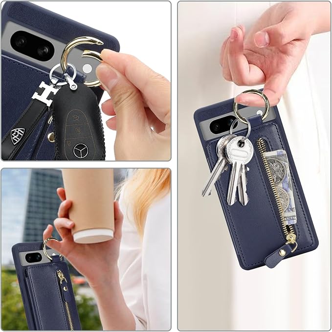 Havaya 対応 Pixel 7a ケース ピクセル7a ケース カード収納 米軍MIL規格 リング付き キーホルダー キーリング Google 耐衝撃 au docomo スタンド機能 SoftBank 財布 フェイクレザー-ブルー