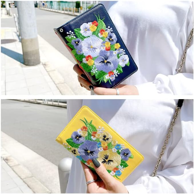 【パンジーの花束をフェルト刺繍した華やかな手帳型ケース】印刷ではなく実際に刺しゅうを施しているため、刺繍の部分が若干膨らんでいる場合がございますが、不良品ではございませんので、予めご了承ください。開閉部分にマグネットを内蔵しておりますが、磁器エラーを防ぐために磁器を弱めにしております。カチッと留まるほどではございませんので、予めご了承ください。