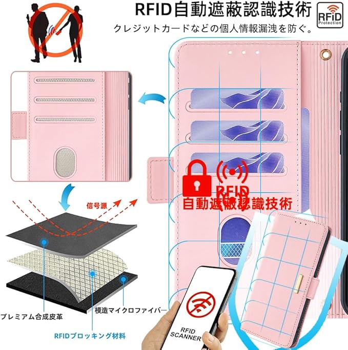 【機能性4:カード収納と安全保護】窓口式のカードスロットとサイドポケットも装備しております。ちょっとした外出する際に、財布が無くても手帳型ケースだけで十分です。内蔵マグネットの留め具なのでピタッと閉まります。クレジットカードなどの情報漏洩を防ぐために、カード入れの内側にRFID自動遮断の素材を採用します、無接触なプライバシー盗難から個人情報を防衛します。ご注意:電磁波を遮蔽する素材なので、カードをいれたままの読み取りはできません。
