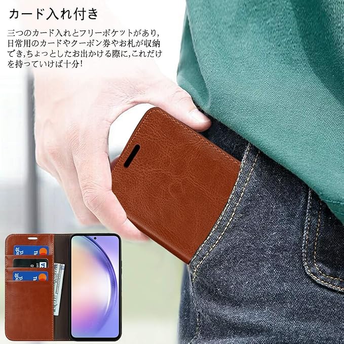 【機能性①】:シンプルでシックなデザインで、場所問わず長くご愛用いただける手帳型です。丈夫で、汚れ防止と摩擦耐性を持つスマホケースです。