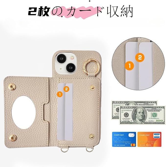 【ショルダータイプ + リング付き +ミラー+カードケース】背面 落下防止 リング、ストラップ、カード入れ、カードが3枚入りますが(横に差し込む3枚入り) 交通ICカードやポイントカードなどを入れることができます。取り外しが簡単にできるところも使い易いと googleピクセル9 ケース