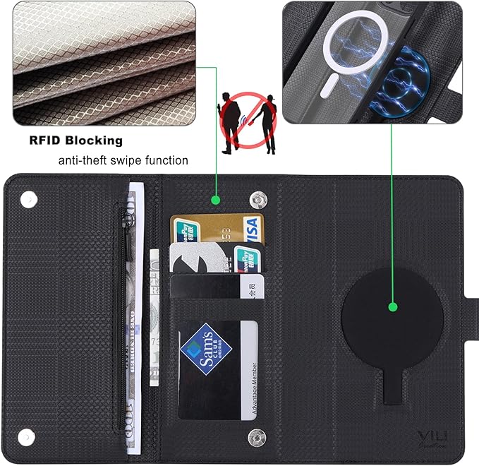 お財布部分とカード収納部分はマグネットでしっかり閉じられるため、スマートフォン操作中にカード等を見られることがありません。