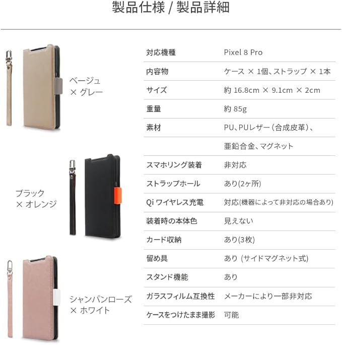 【製品仕様】… ◆ 対応機種 : Google Pixel 8 Pro ( グーグル ピクセル 8 プロ ) ◆ 内容物 : ケース 1個、ストラップ 1本 ◆ サイズ : 約 16.8cm 9.1cm 2cm ◆ 重量 : 約 85g ◆ 素材 : TPU、PUレザー(合成皮革)、亜鉛合金、マグネット