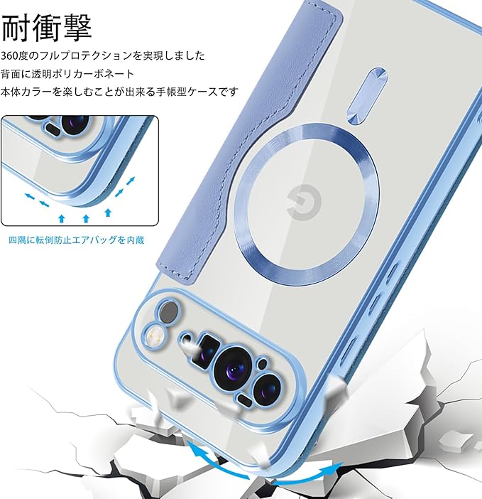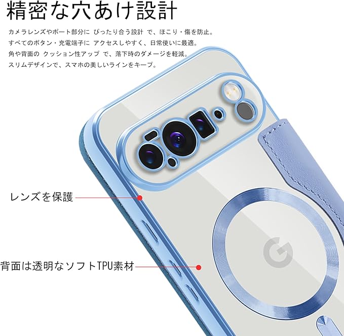 Google Pixel 10 Pro XL用 ケース 手帳型 Magsafe対応 背面 透明 かわいい グーグル ピクセル10 Pro XLスマホケース カード収納 財布付き 耐衝撃 薄型 軽量 TPU+PUレザー 全面保護 耐摩擦 ストラップホール付きカバー,ライトブルー