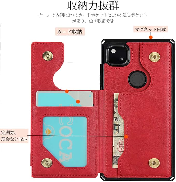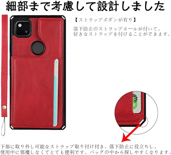Google Pixel 4A 縄掛け ケース Pixel 4A 背面 PUケース Pixel 4A カード収納 Pixel 4A 手帳型 カバー Pixel 4A 背面カード 収納 Pixel 4A 背面 手帳型 PUカバー 磁気ボタン Cavor Pixel 4A 携帯 カバー Pixel 4A 財布型 カバー 付きの専属ストラップ同梱なので タンド機能 内蔵マグネット 名刺入れ 小銭入れ suicaカード ICカードホルダー 軽量 耐久性 便利 多機能 落下保護 Qi急速充電対応 【レッド】